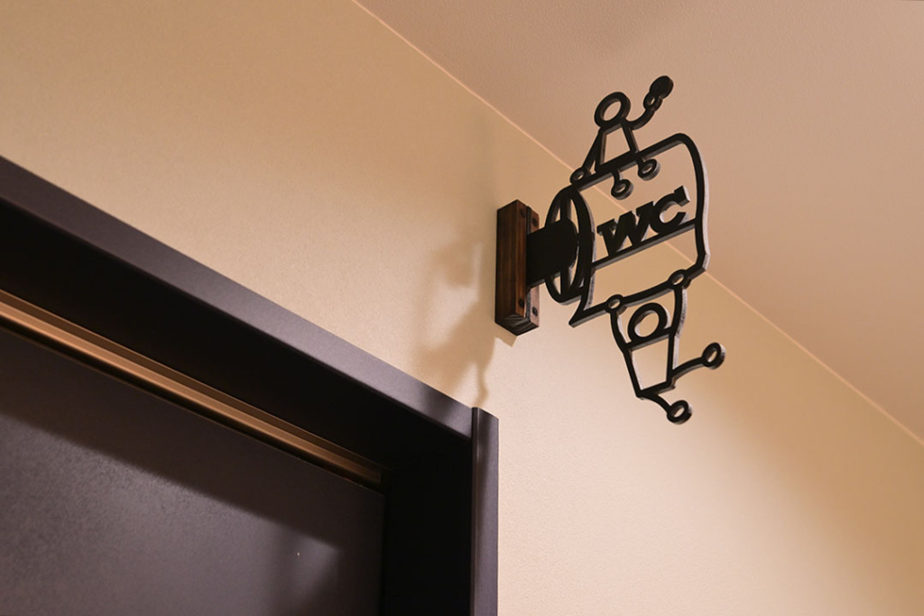 WCの扉上にはホロスガレージ製作のサインプレート。