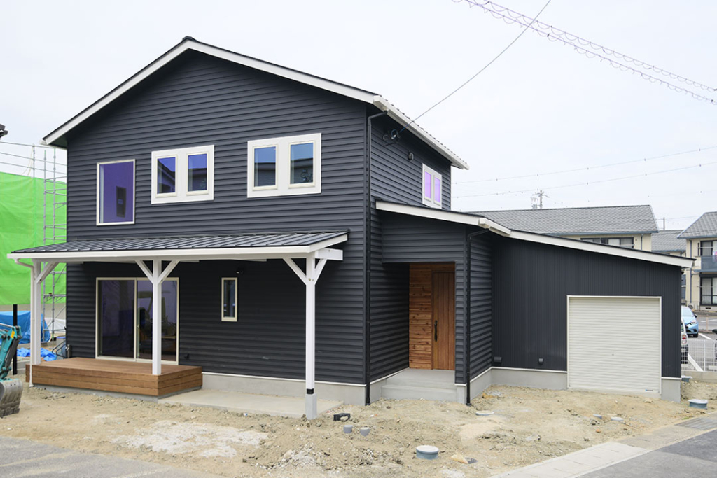 カリフォルニアスタイルの外観で、黒の外壁に白の窓モールをつけてメリハリをつけました。