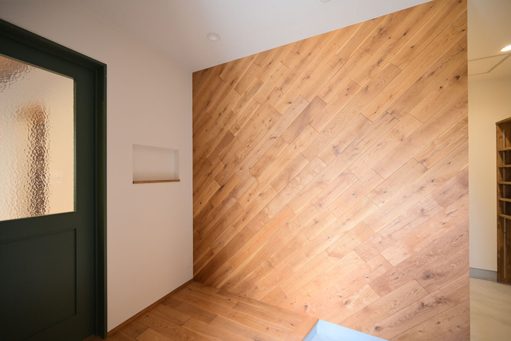 壁に床材を斜めに貼ったアクセントウォールが目をひきます。