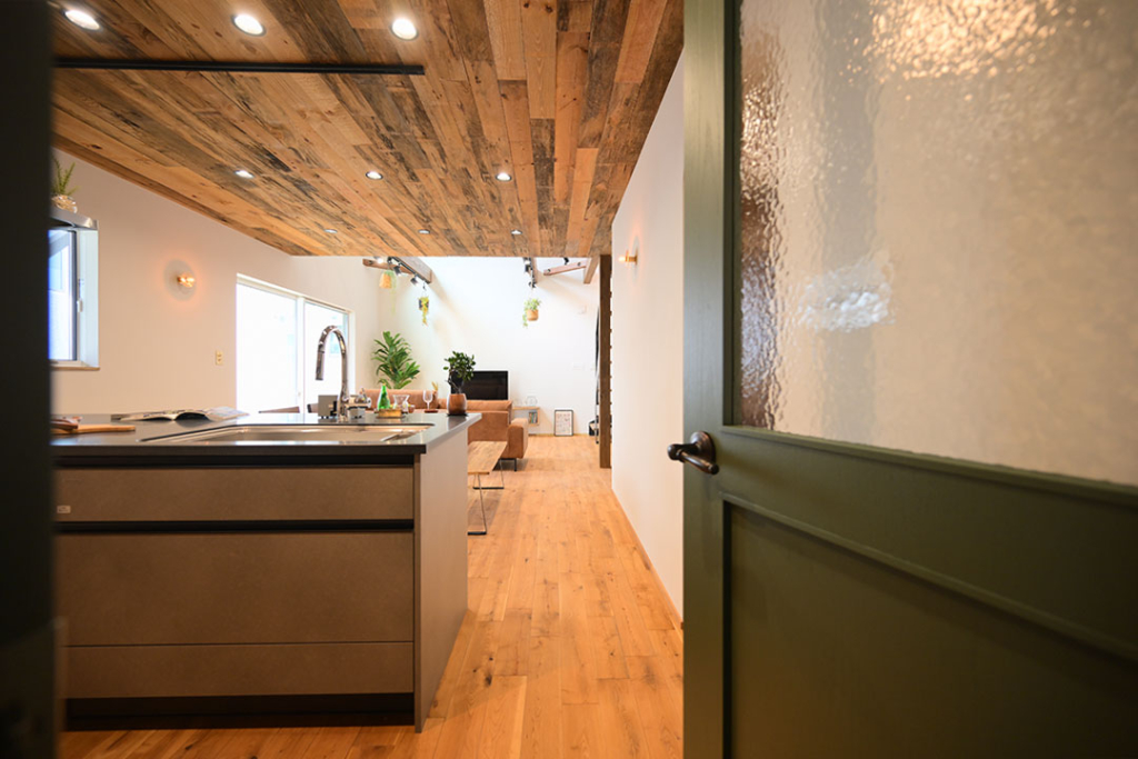 リビングの床は無垢のオーク材、天井は古風板を使用しています。