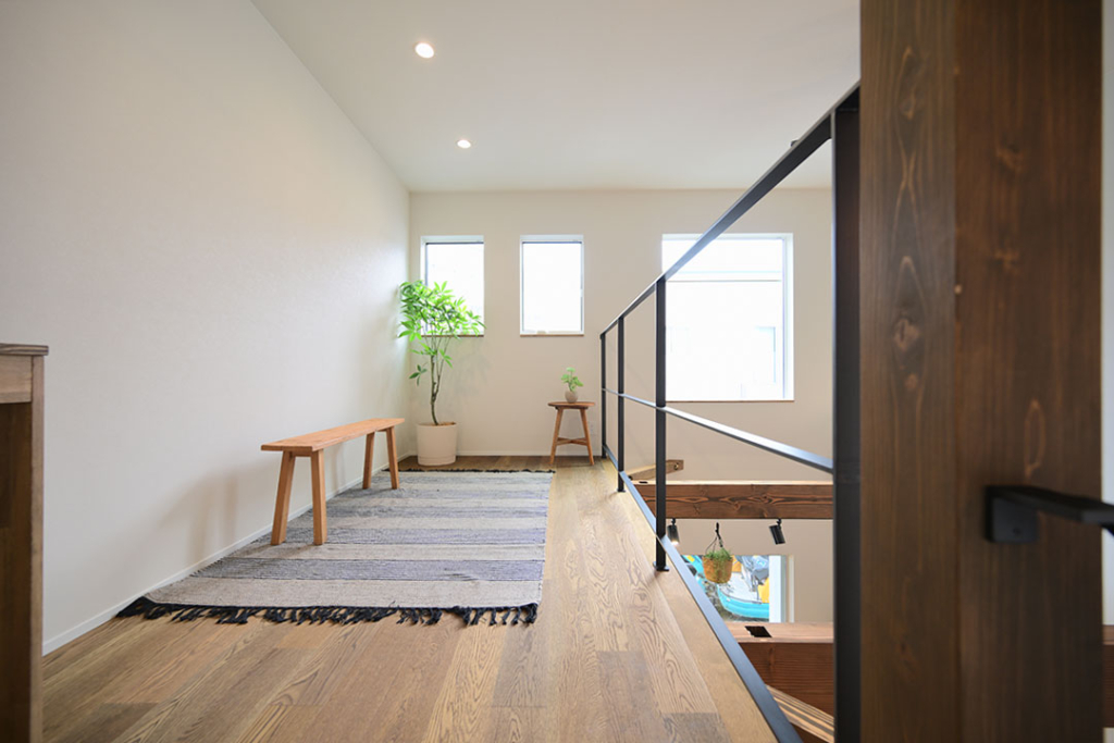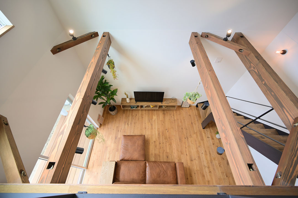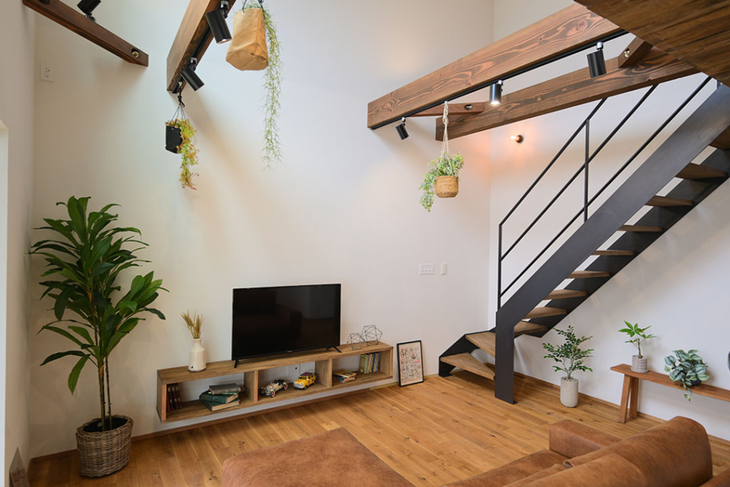 吹き抜け部分の梁には観葉植物を吊るすこともできます。