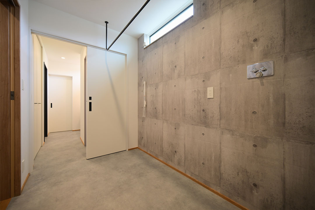 ご主人も好きなコンクリート打ちっぱなし風のアクセントクロスを使用。