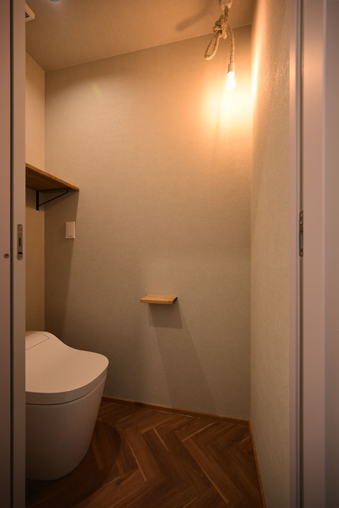 ヘリンボーンの床に、手編みロープの照明がナチュラルで可愛い雰囲気のトイレ。
