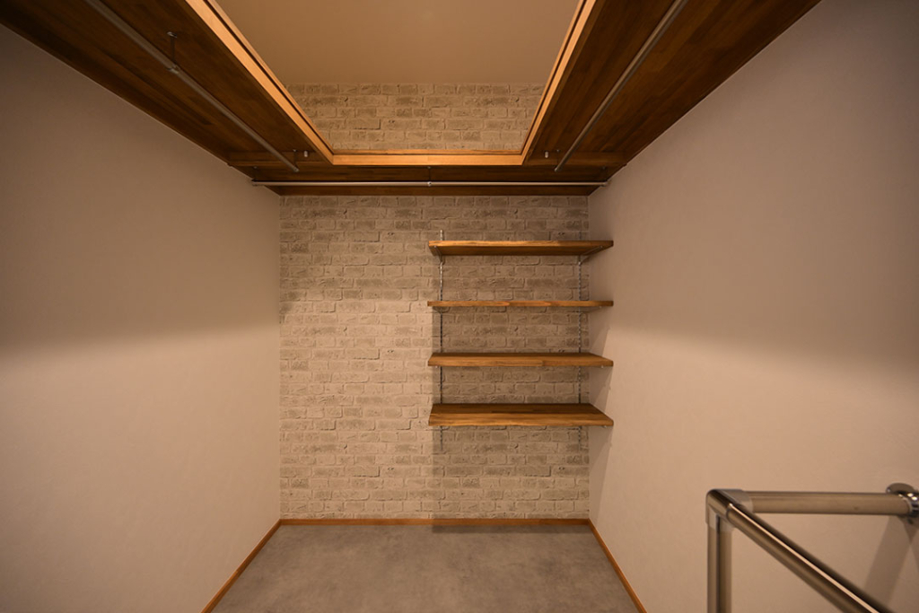 ファミリークローゼットの壁は、リゾート感とかっこよさも出るレンガ調のアクセントクロスを使用しました。