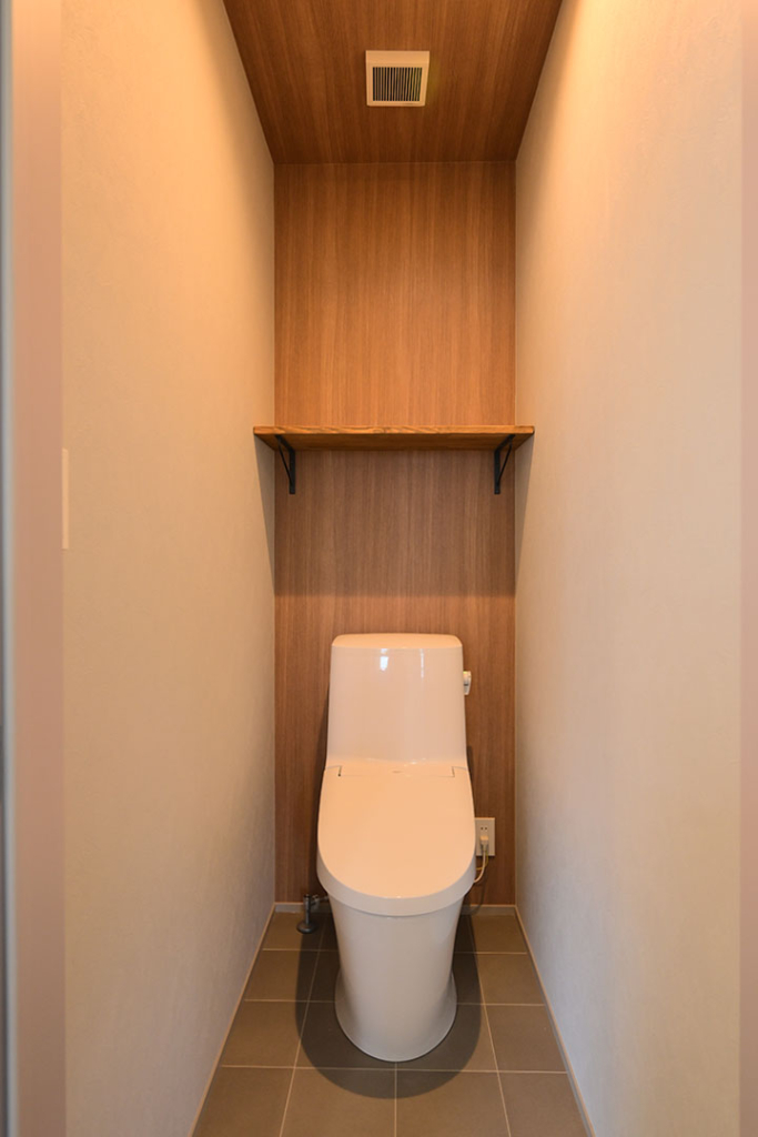 2Fのトイレは木目調のアクセントクロスがポイントに。