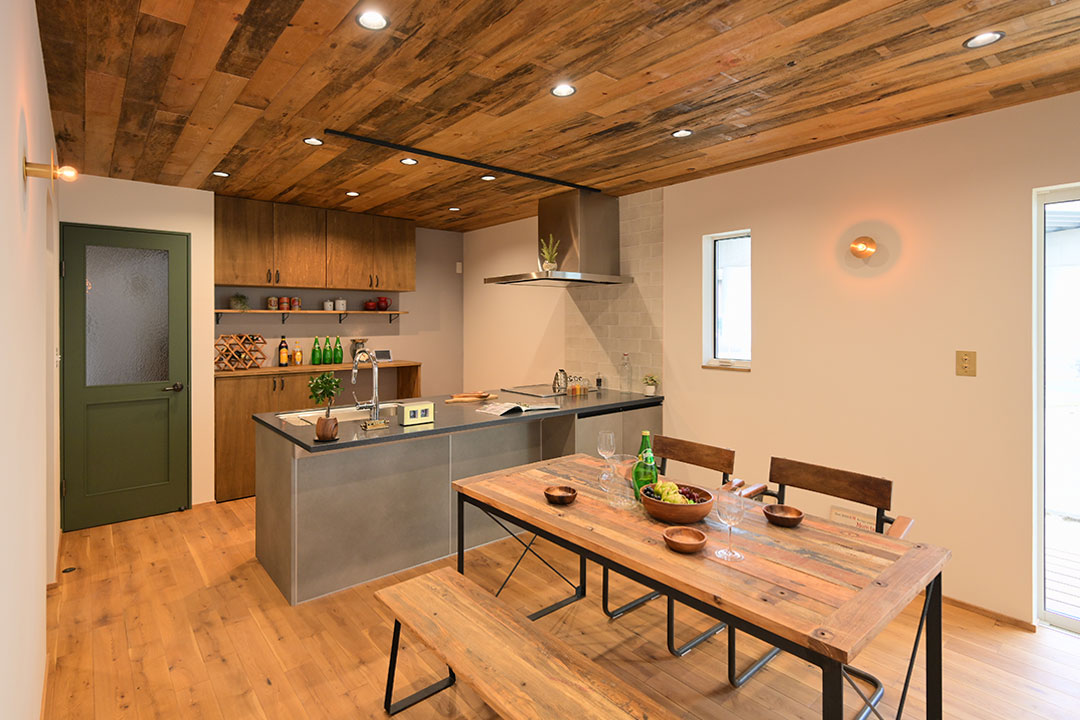 リビングの床は無垢のオーク材、天井は古風板を使用しています。