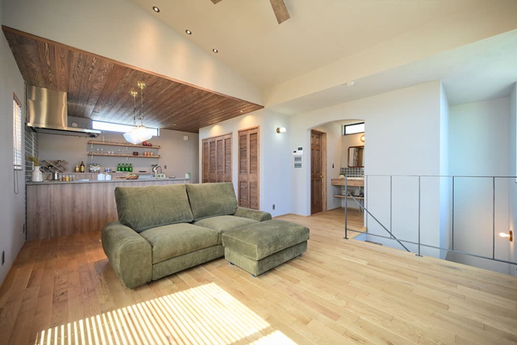 ・壁と天井にはエスタコウォールを使用。キッチンの下がり天井は杉板。