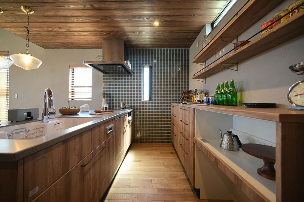 キッチンの下がり天井には杉板を用いて、メリハリをつけました。