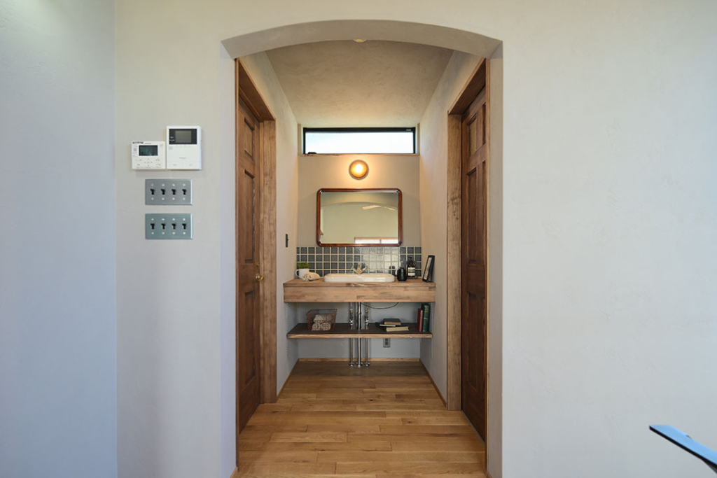 LDKと水回りを仕切るアーチ垂れ壁は、可愛くなりすぎないようにアーチ部分を緩やかに。