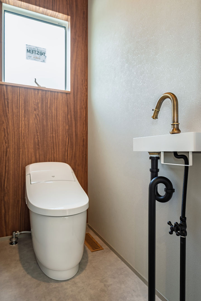 木のアクセントクロスと、ゴールドの水栓、黒の配管がヨーロピアンな雰囲気を醸し出します。
