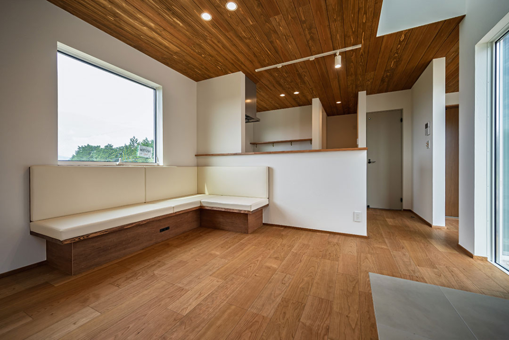 備え付けの造作ベンチソファ。ホロスガレージで製作した物です。
