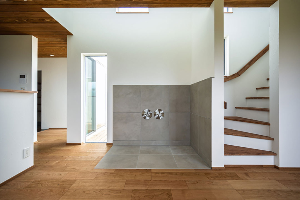 ベンチソファの正面には、薪ストーブを置くためのスペースを。