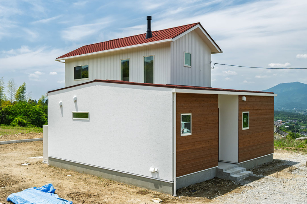 白を基調に、赤みの強い木材と赤い屋根が可愛らしい外観です。