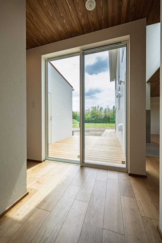 玄関入って正面に、ウッドデッキへと続く掃き出し窓。